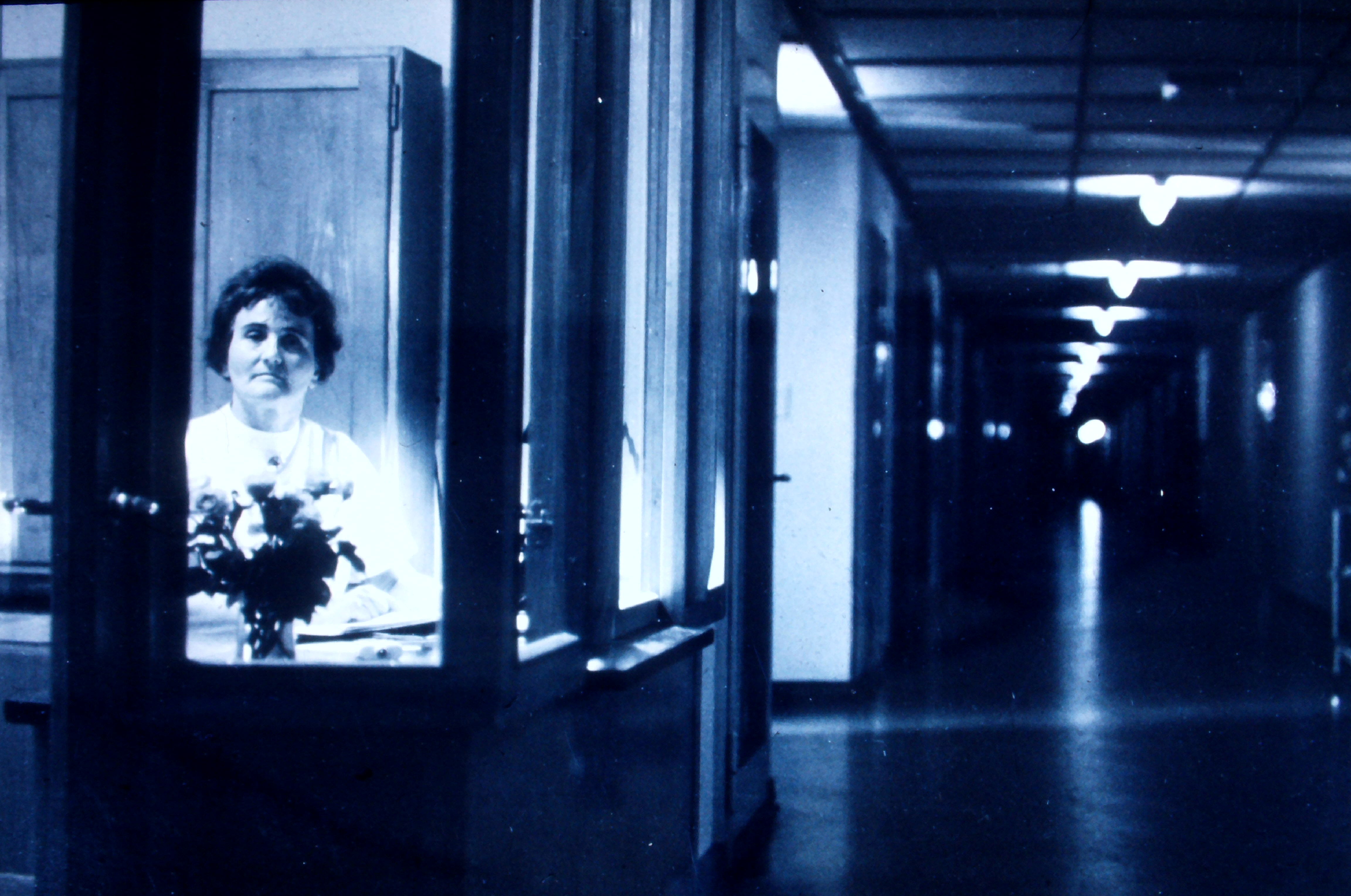 [Femme surveillant l'accès à un couloir d'hôpital]