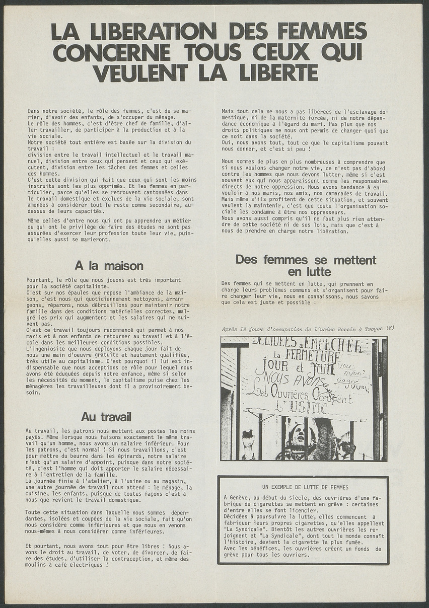 Affiche-tract sur les luttes des femmes à l'usine, dans les quartiers et à la maison, et pour une conférence de Françoise Chomienne sur les femmes chinoises. Encart relatant l'histoire de « La Syndicale », des cigarettes fabriquées par des cigarières en grève au début du siècle à Genève.