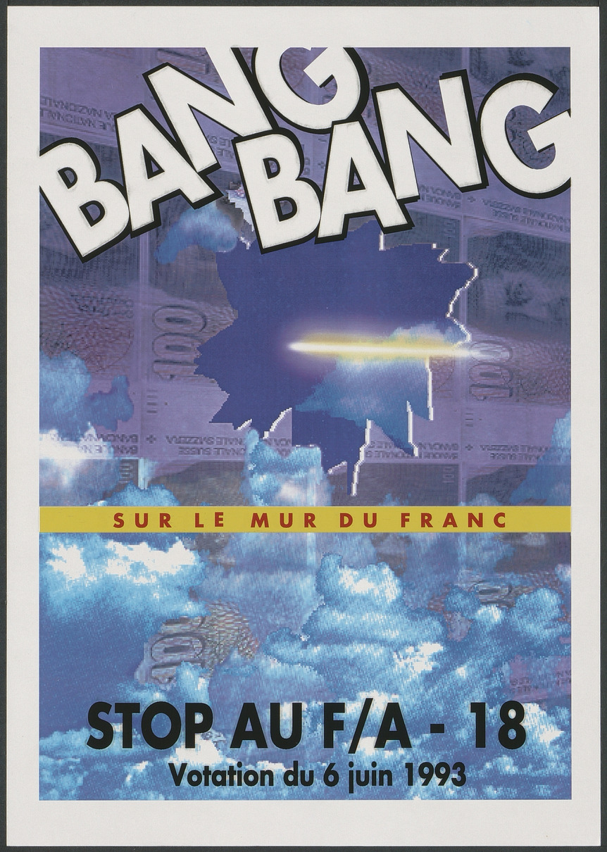 Affiche à l'occasion de l'initiative Pour une suisse sans nouveaux avions de combats représentant un mur de billets de 1'000 CHF transpercé, au dessus de nuages.