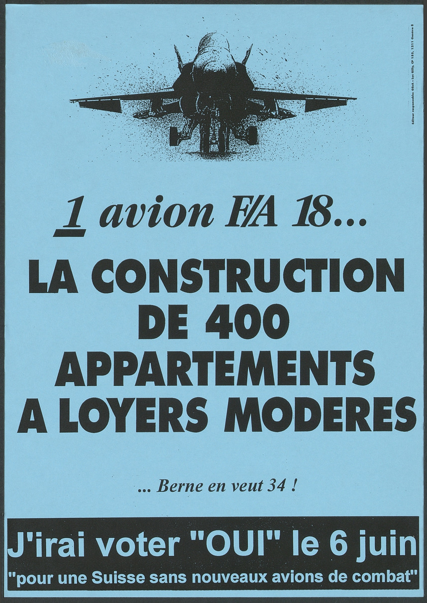 En 1992, le parlement décide de l’achat de 34 avions de combat F/A-18. Le GSsA lance une initiative pour une Suisse sans nouveaux avions de combat. En un mois, 503’519 signatures sont récoltées. Au mois de mai, suite à une initiative parlementaire, le principe d’un service civil est largement plébiscité par le peuple. La loi n’entrera en vigueur qu’en 1996, suite à d’âpres discussions parlementaires.