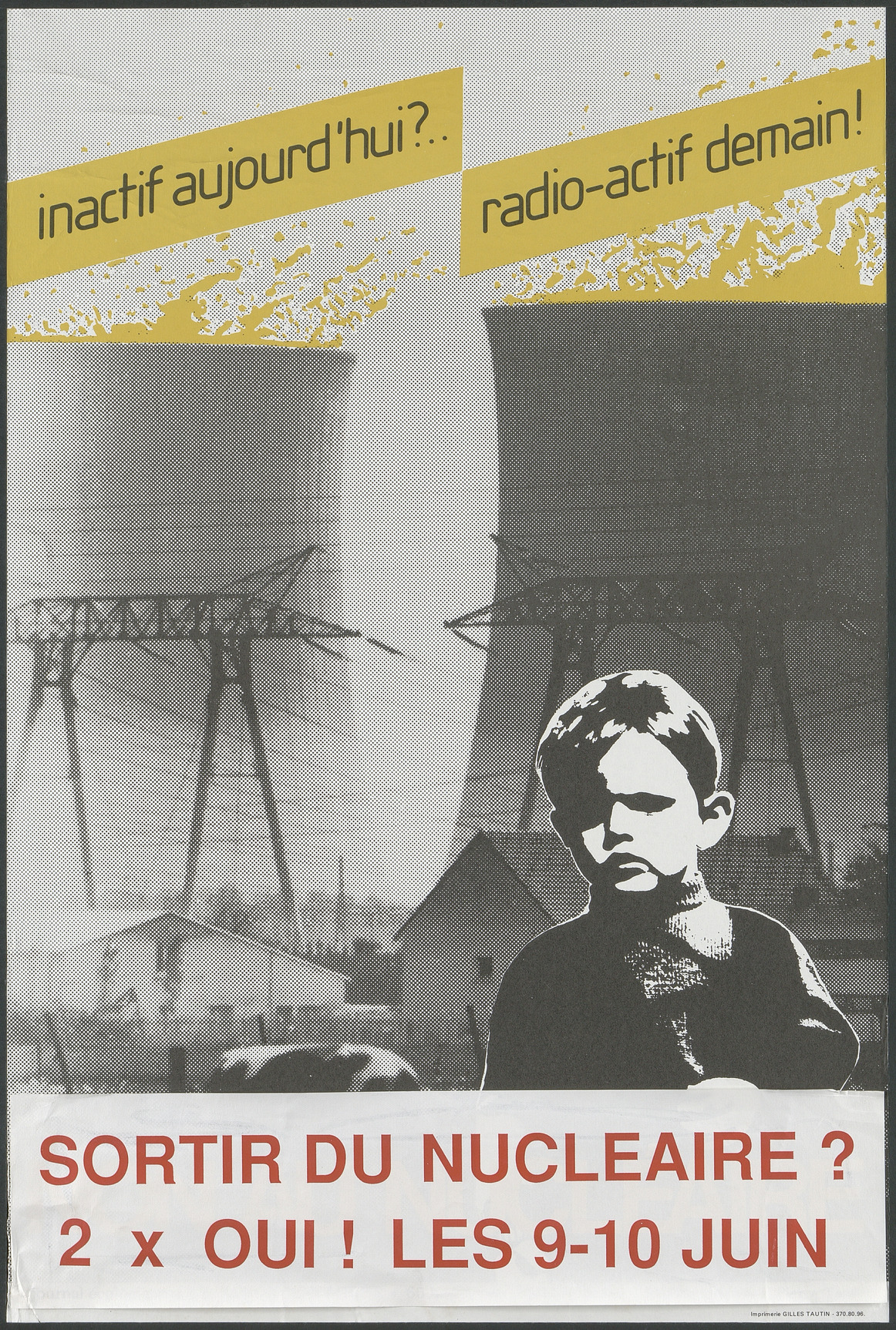 Affiche antinucléaire représentant un enfant devant des lignes à haute tension. Un bandeau appelant à une votation contre le nucléaire est collé en bas de l'affiche mais ne semble correspondre à aucune date de votation ayant eu lieu sur ce sujet.