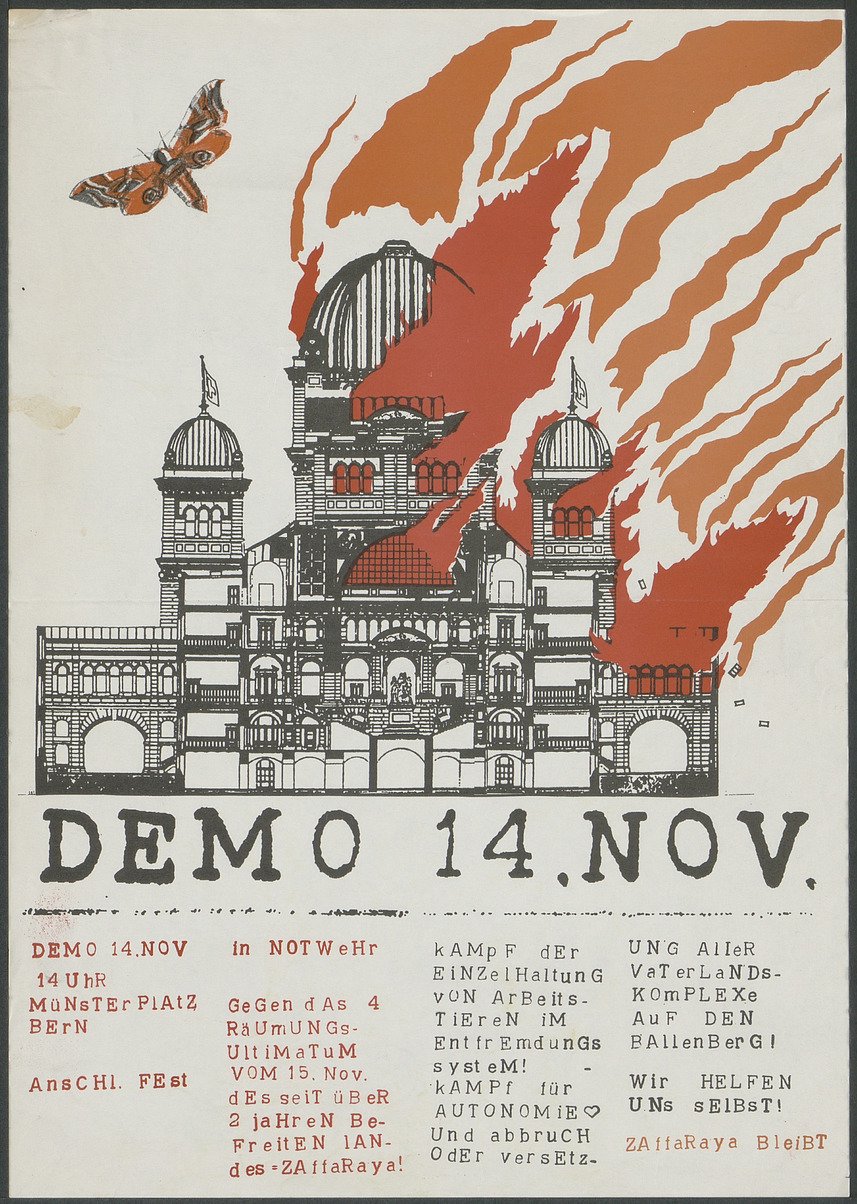 Affiche appelant à une manifestation contre l’évacuation du territoire autogéré à Berne. Dessin représentant le parlement suisse en feu, un papillon s'envole en haut à gauche.