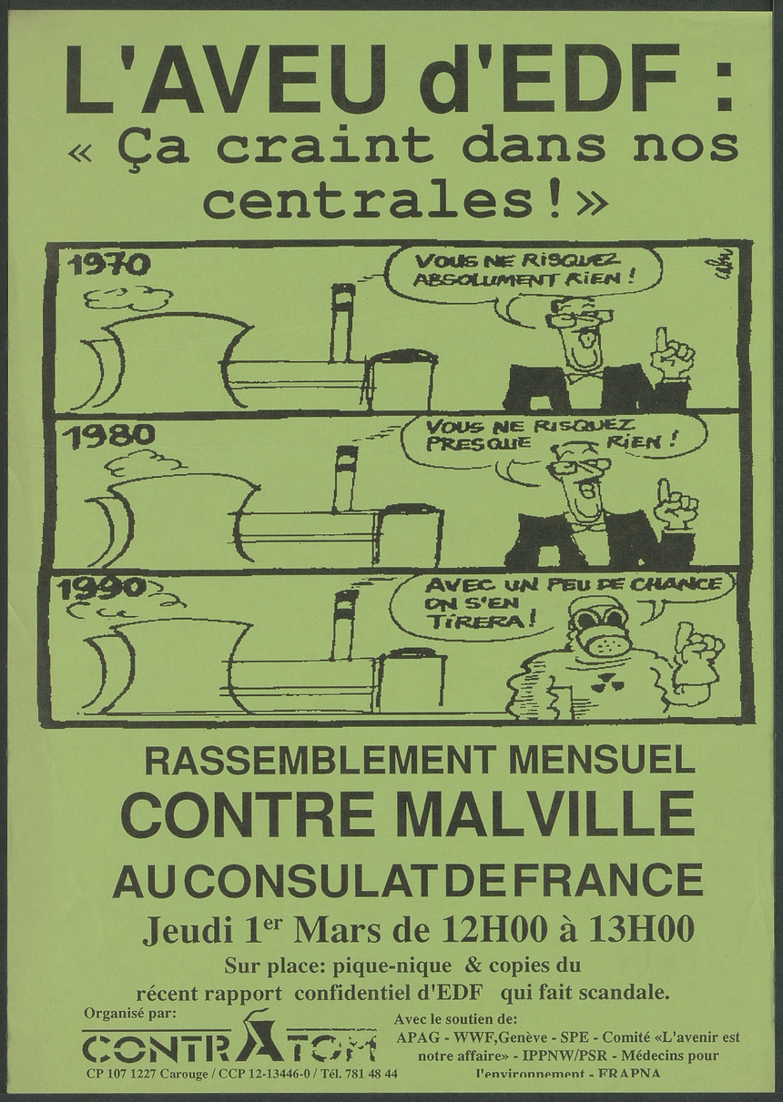 Affiche pour un rassemblement mensuel « contre Malville » devant le Consulat de France. « Sur place : pique-nique et copies du récent rapport confidentiel d'EDF qui fait scandale ». Caricature en trois cases ironisant sur le discours sur les risques causés par le nucléaire.