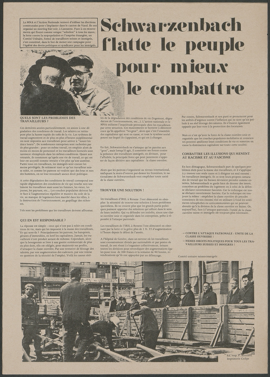 Affiche sur l'implantation d'Action Nationale dans le canton de Vaud et sur Schwarzenbach. Verso en italien et espagnol.