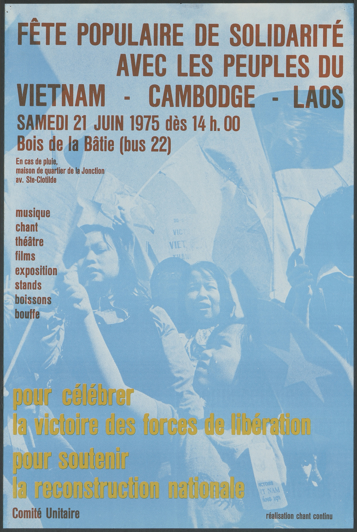Affiche pour une fête « pour célébrer la victoire des forces de libération, pour soutenir la reconstruction nationale » du Vietnam, Cambodge et Laos au Bois de la Bâtie. Musique, chant, théâtre, films, exposition, stands, boissons, bouffe.