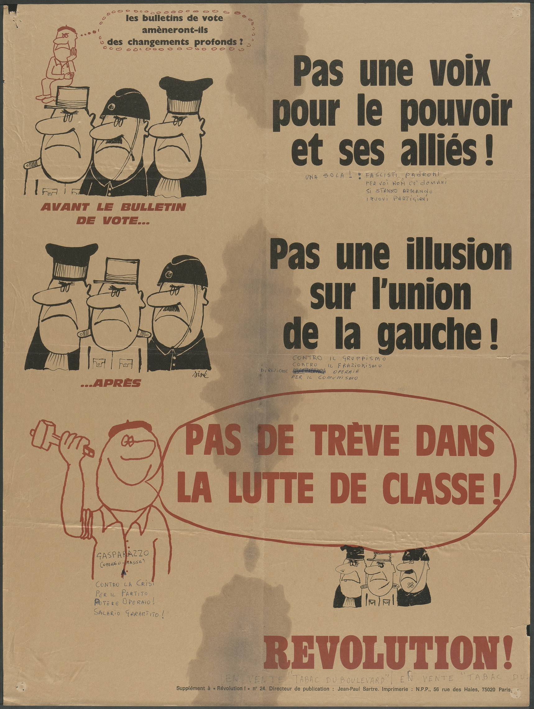Affiche sur des votations en France. Supplément à Révolution n°24. Dessin de Siné représentant un juge, un militaire et un policier mécontents, avant et après le vote.
