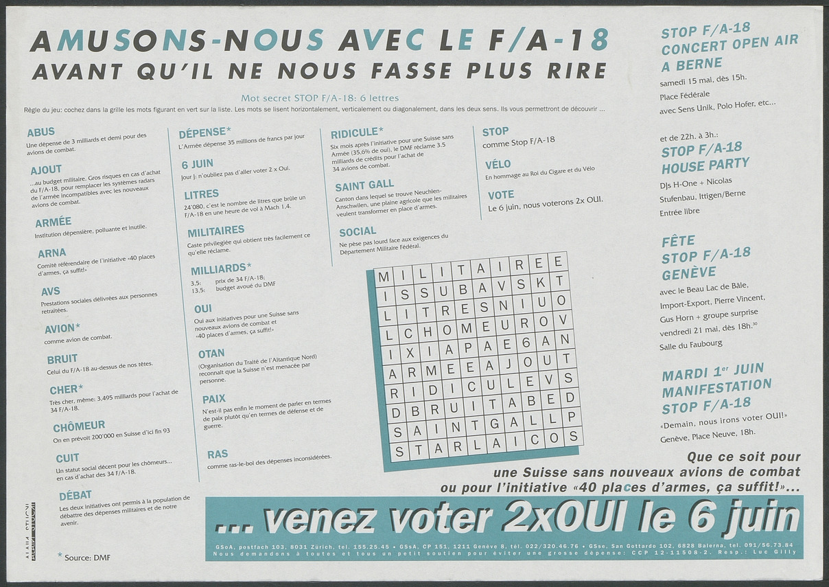 Affiche / mot-secret « STOP F/A-18 » et promotion de concerts, fêtes et d'une manifestation à Berne et à Genève à l'occasion de l'initiative populaire pour une Suisse sans nouveaux avions de combat et pour l'initiative « 40 places d'armes, ça suffit ».