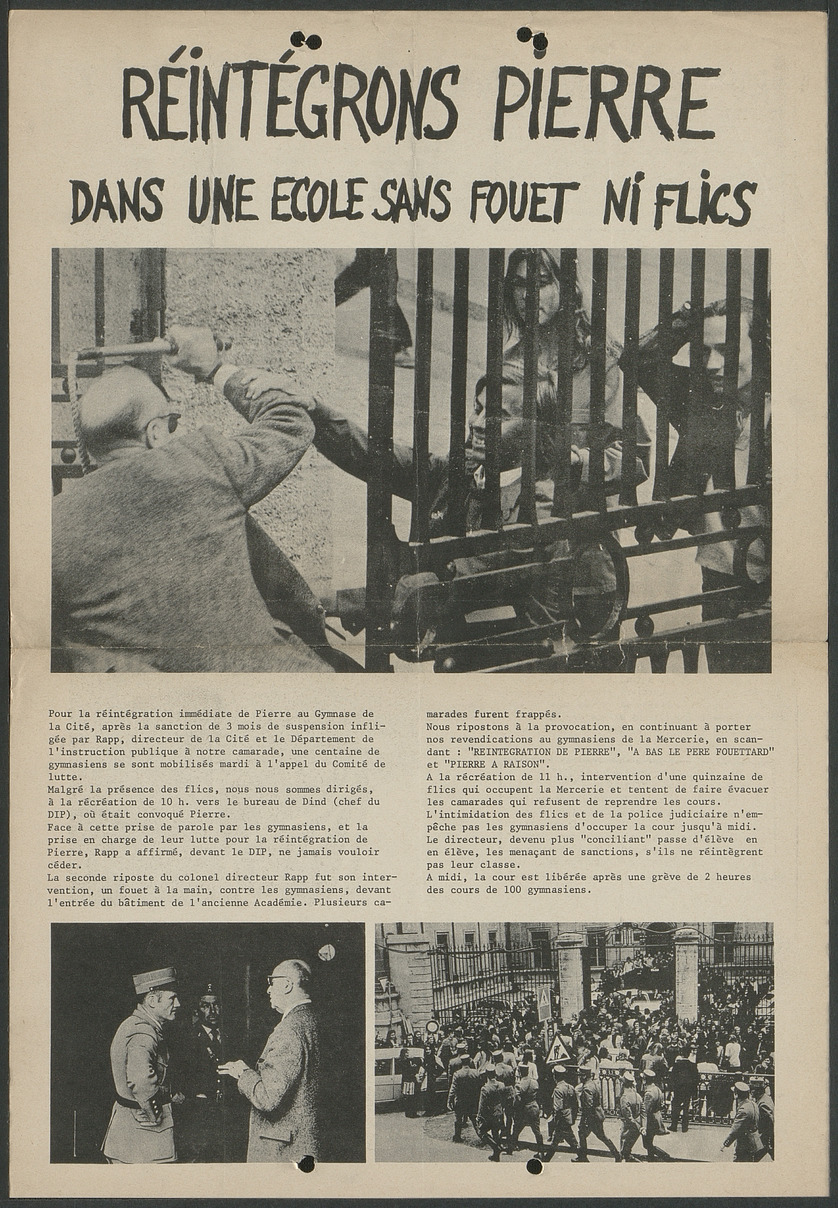 Affiche reproduisant un texte pour « la réintégration de Pierre au Gymnase de la Cité [Lausanne], après sanction de 3 mois de suspension ». Le texte relate l'action des élèves pour leur camarade : occupation du bureau du directeur, prise de parole, heurts avec la police, deux heures de grève des cours. L'élève est finalement relaxé par le DIP. Photographie de l'événement et portrait du directeur un fouet à la main.