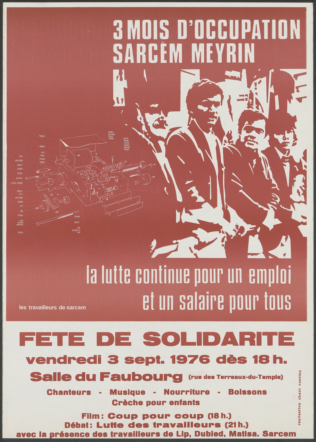 Le 25 mai 1976 les directeurs de l'usine de mécanique SARCEM à Meyrin annoncent qu'ils ne peuvent pas verser les salaires de mai. Le 31 mai, alors que la paye n'arrive pas les employé.es interrompent le travail à 15h30 et se réunissent en assemblée. Ils désignent à ce moment là un comité d'entreprise pour s'adresser à la direction. Le lendemain le patron annonce au comité son intention de déposer le bilan tout en lui proposant de participer à un plan de redressement. Les travailleurs et travailleuses reprennent le travail jusqu'à ce qu'ils apprennent que leur patron a en réalité déjà déposé le bilan. L'occupation immédiate de l'usine est votée à l'unanimité. Elle durera 4 mois, jusqu'au rachat de l'entreprise avec la garantie pour tou.tes les employé.es de conserver leur poste aux mêmes conditions. Tout au long de la mobilisation les ouvriers.ères, organisé.es en assemblée, signent leurs communications "les travailleurs de SARCEM".