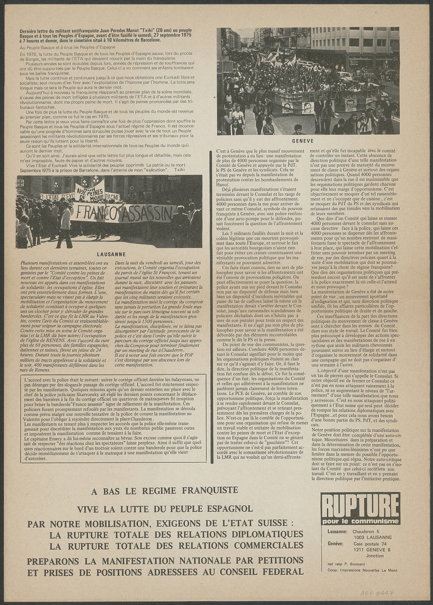 Affiche reproduisant un texte sur l’exécution de cinq militants anti-franquistes. Photographies de deux manifestations de protestation, à Genève et Lausanne.