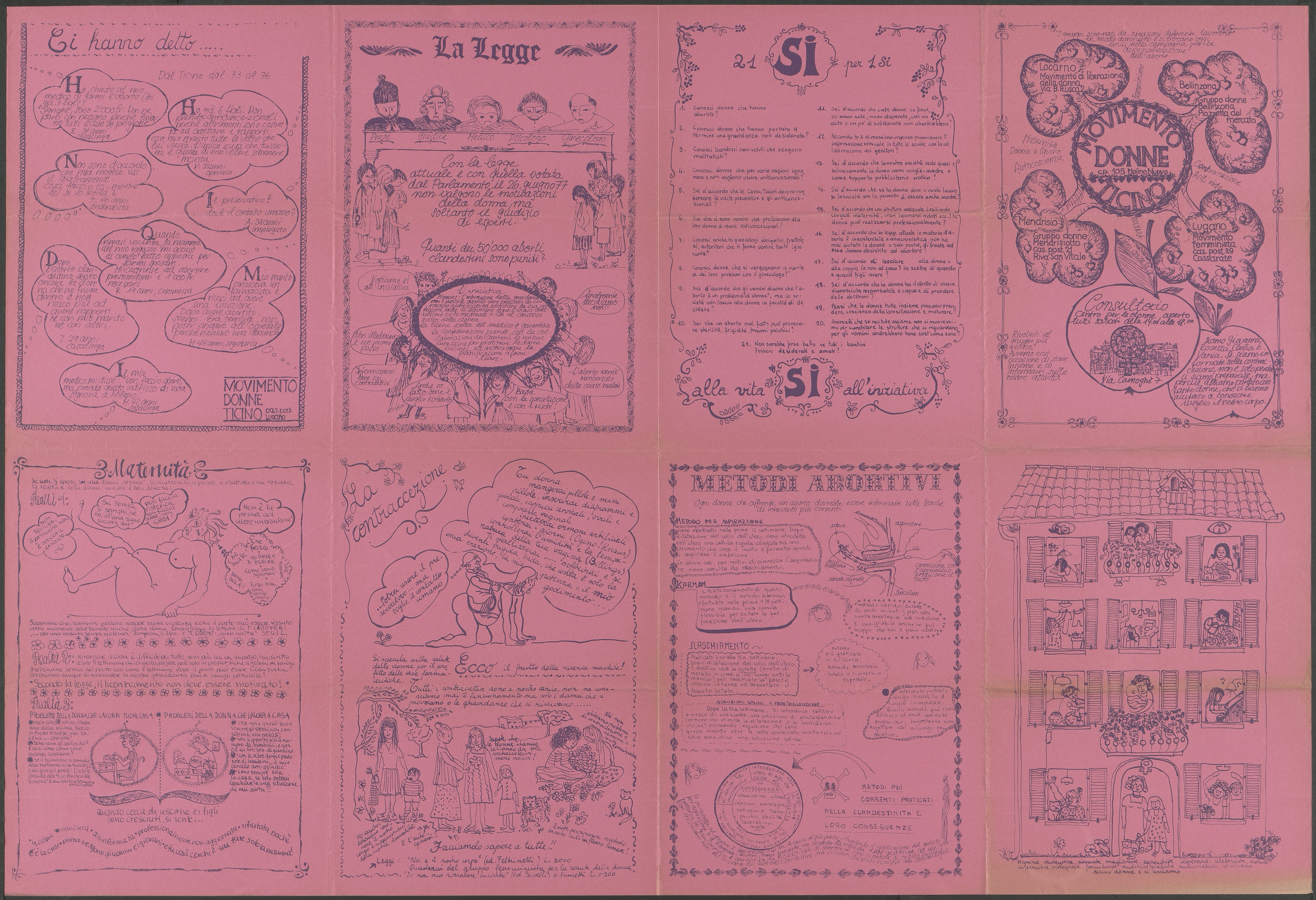 Affiche du mouvement des femmes du Tessin. Maternité, avortement, contraception.