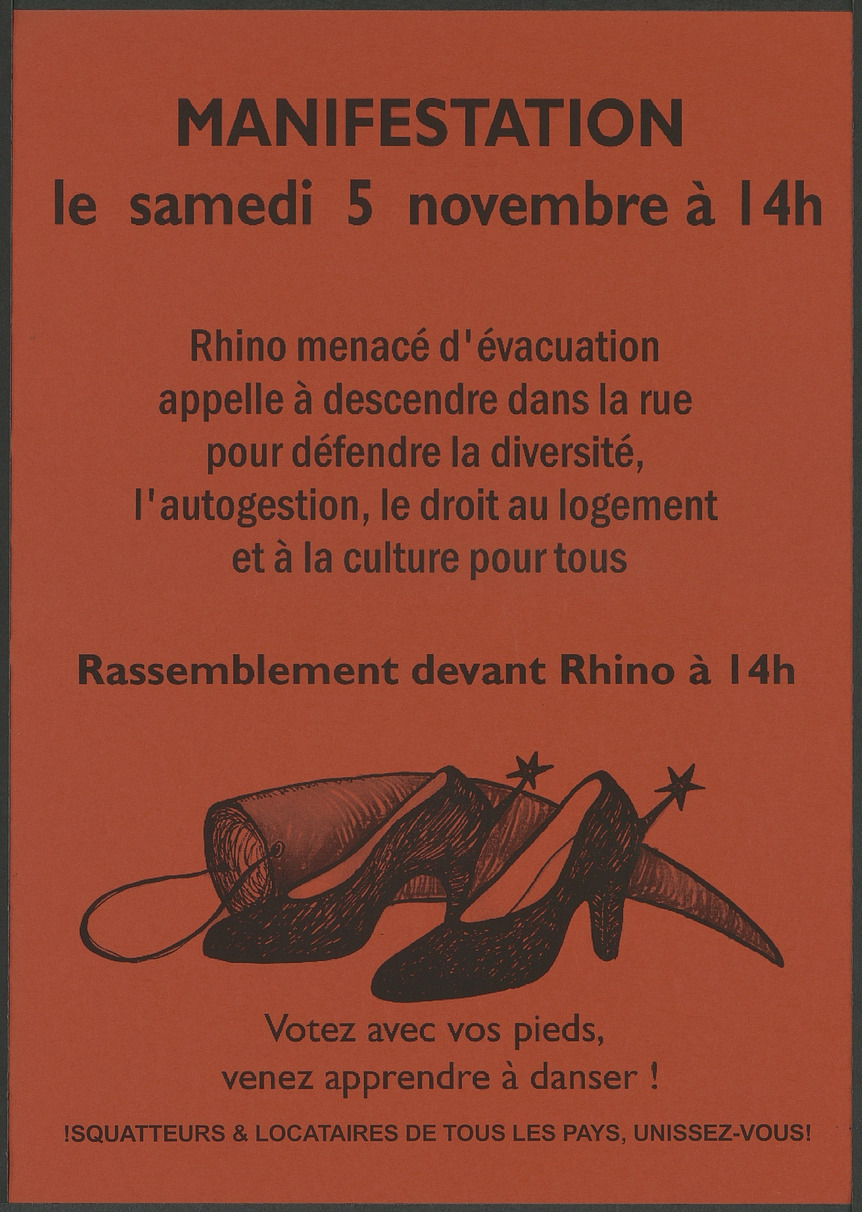 « Pour défendre la diversité, l'autogestion, le droit au logement et à la culture pour tous ». Dessin de chaussures à talons et d'une corne de rhinocéros.