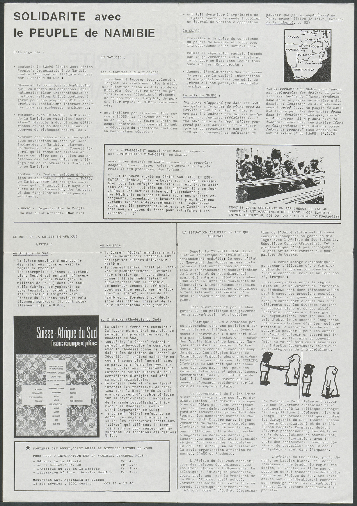 Affiche pour une exposition, des films et un débat sur les luttes anti-apartheid en Afrique du Sud, sur la situation en Afrique australe et sur le SWAPO (South West Africa People's Organization) de Namibie.