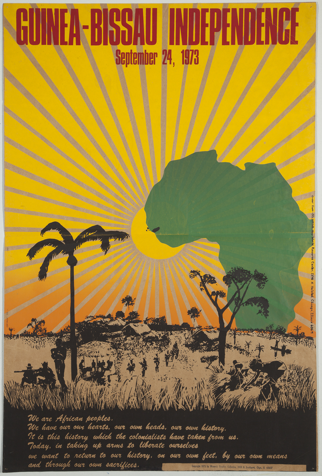Il s'agit d'une affiche sérigraphiée (rouge, jaune, orange, noir et vert sur papier brun) sur l'indépendance de la Guinée-Bissau. L'affiche est commandée par le New World Resource Center, Chicago (USA).