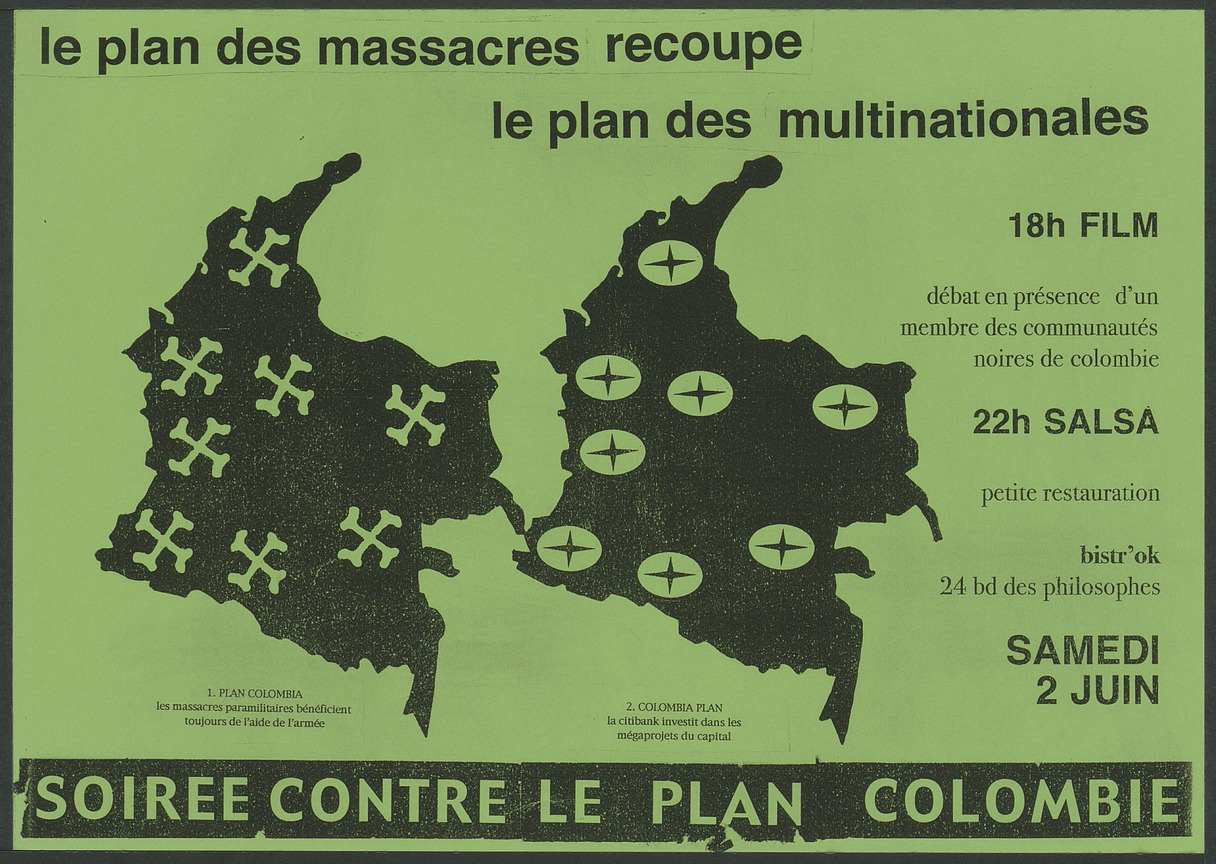 Affiche pour une « soirée contre le plan colombien ». Débat en présence d'un Afrocolombien, soirée.