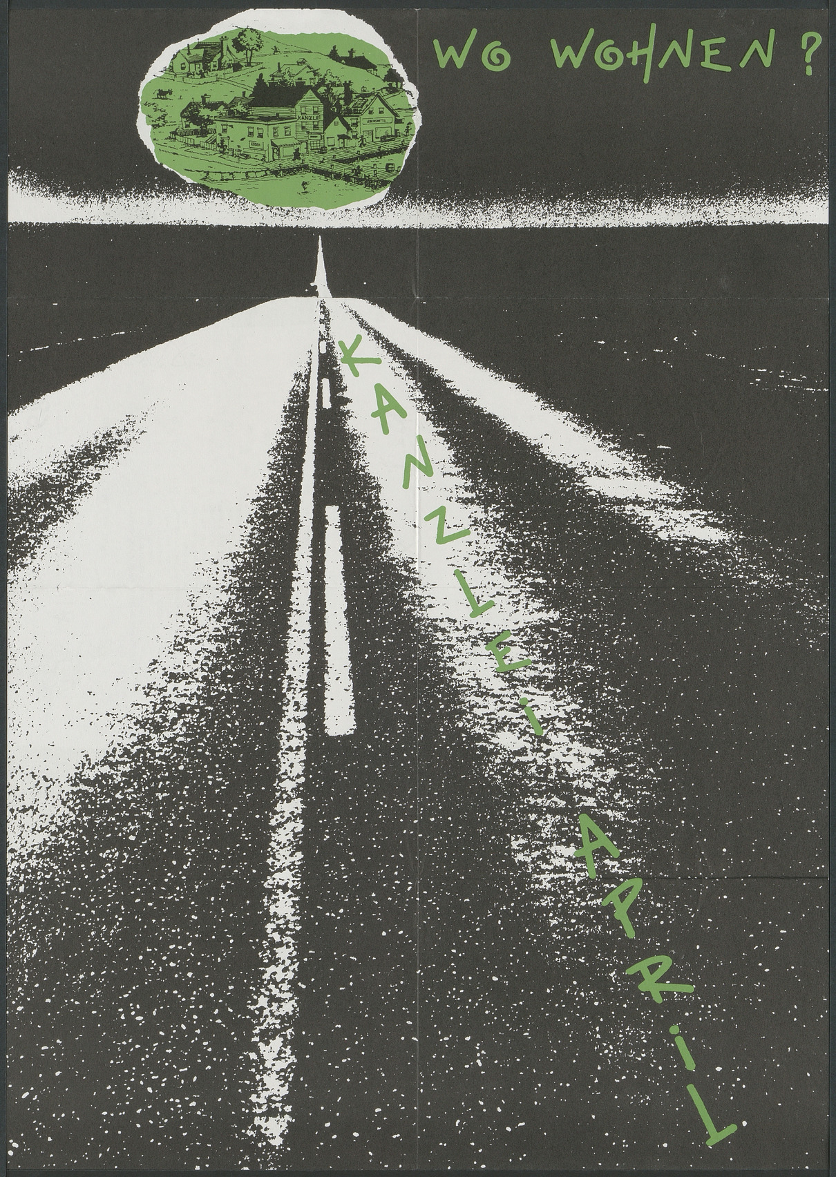 Programme du Quartierzentrum Kanzlei à Zurich. Au recto, image d'une route dans la nuit, dessin d'un village dans une bulle à l'horizon. Détails des activités, spectacles, cinéma, permanences au verso. Un collage reprend des annonces de logement.