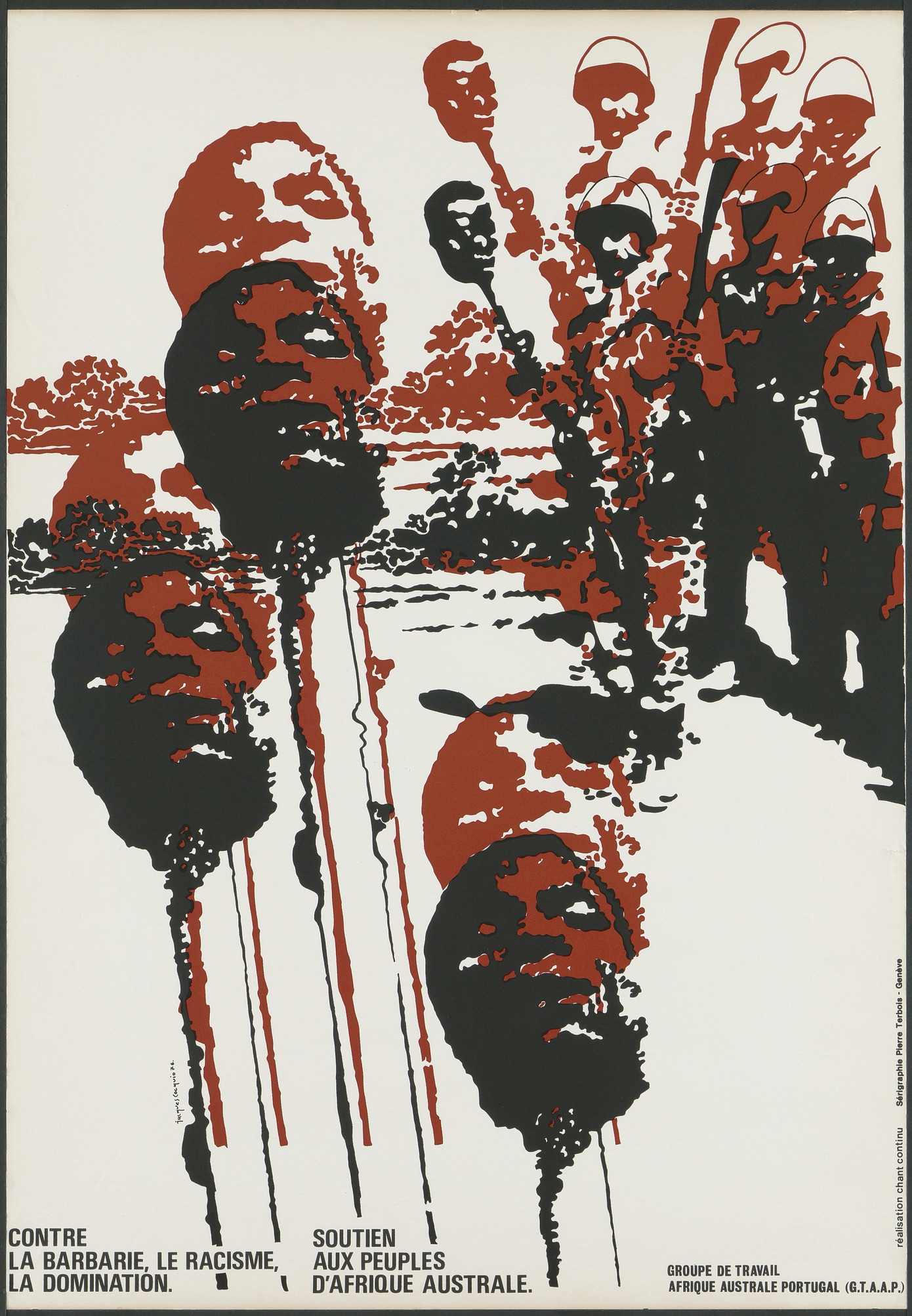 Affiche sérigraphiée avec une illustration de Jacques Cocquio en soutien aux peuples d'Afrique australe.