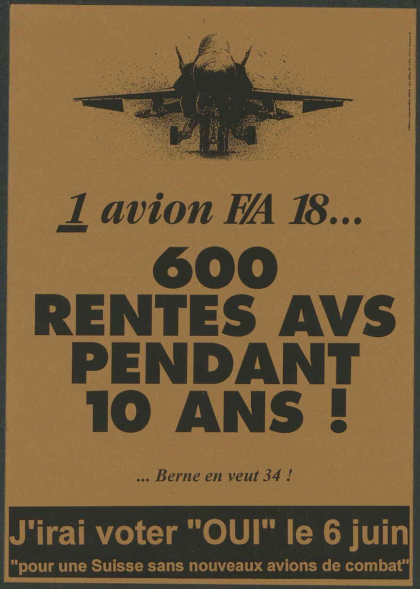 En 1992, le parlement décide de l’achat de 34 avions de combat F/A-18. Le GSsA lance une initiative pour une Suisse sans nouveaux avions de combat. En un mois, 503’519 signatures sont récoltées. Au mois de mai, suite à une initiative parlementaire, le principe d’un service civil est largement plébiscité par le peuple. La loi n’entrera en vigueur qu’en 1996, suite à d’âpres discussions parlementaires.
