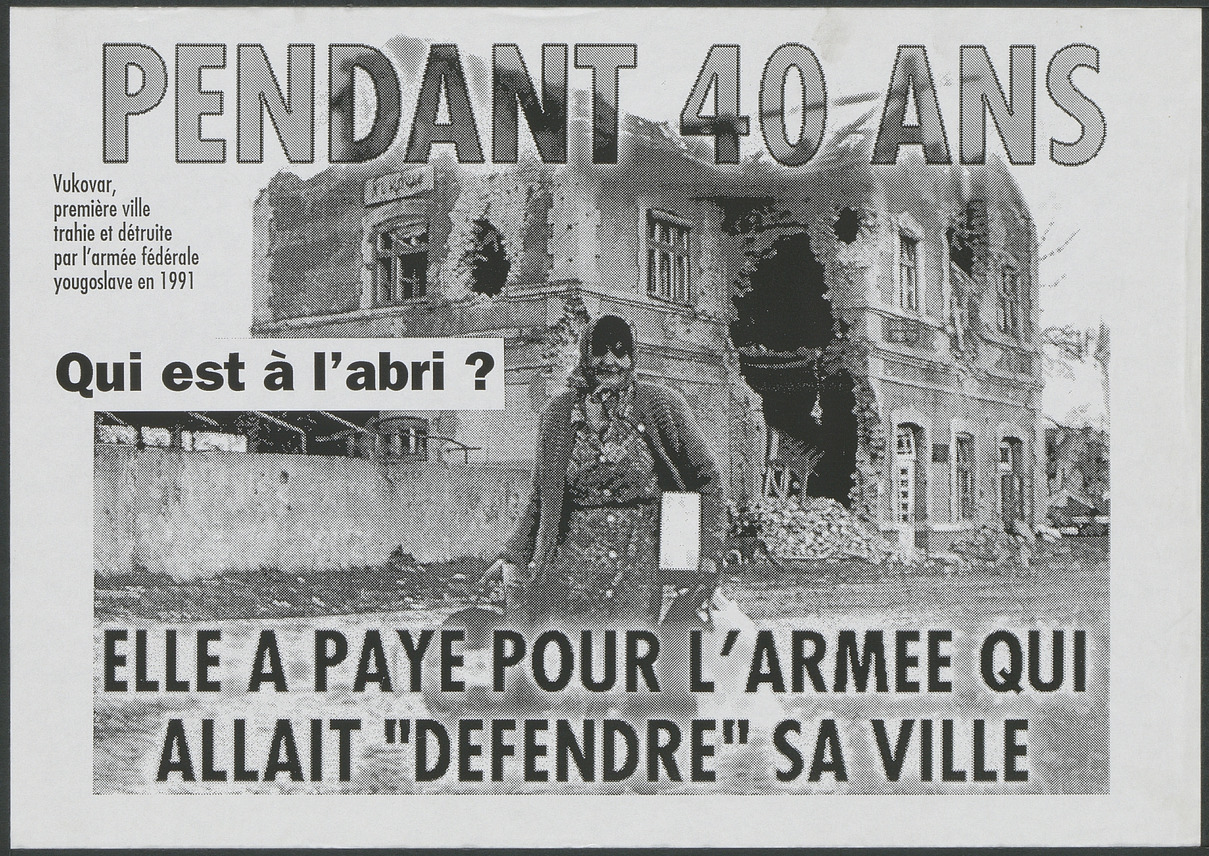 « Pendant 40 ans, elle a payé pour l'armée qui allait "défendre" sa ville ». Photographie d'une femme quittant une maison en ruine, visiblement bombardée.