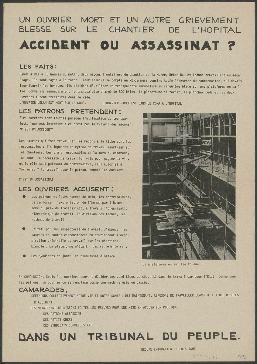 Affiche relatant un accident de travail qui entraina la mort d'un ouvrier maçon dans le chantier de l’hôpital. Le texte pointe la responsabilités des patrons « qui font travailler les ouvriers à la tâche (...) à un rythme de travail meurtrier ». Verso en italien.