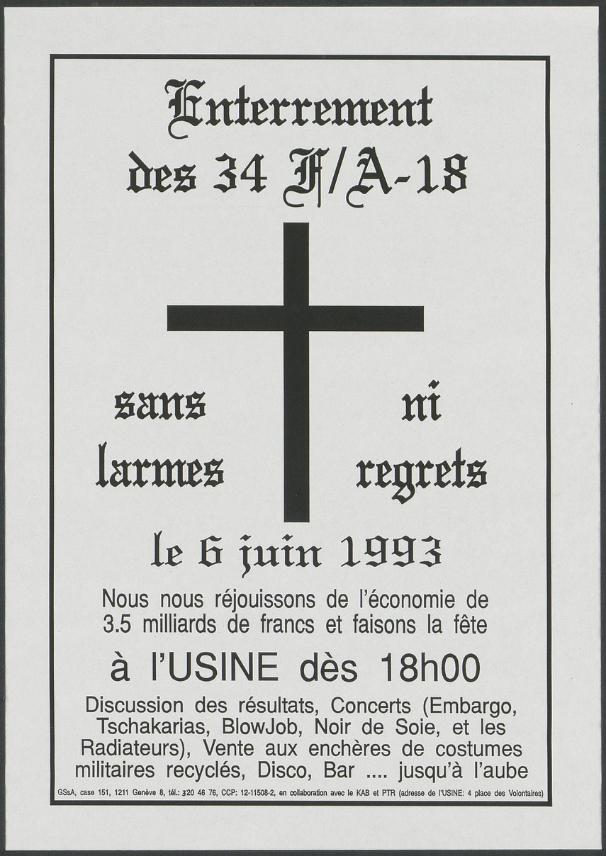 Affiche simulant la victoire pour une fête à l'occasion de la votation sur l'initiative populaire Pour une Suisse sans nouveaux avions de combat invitant à enterrer les F/A-18 « sans larmes ni regrets ».