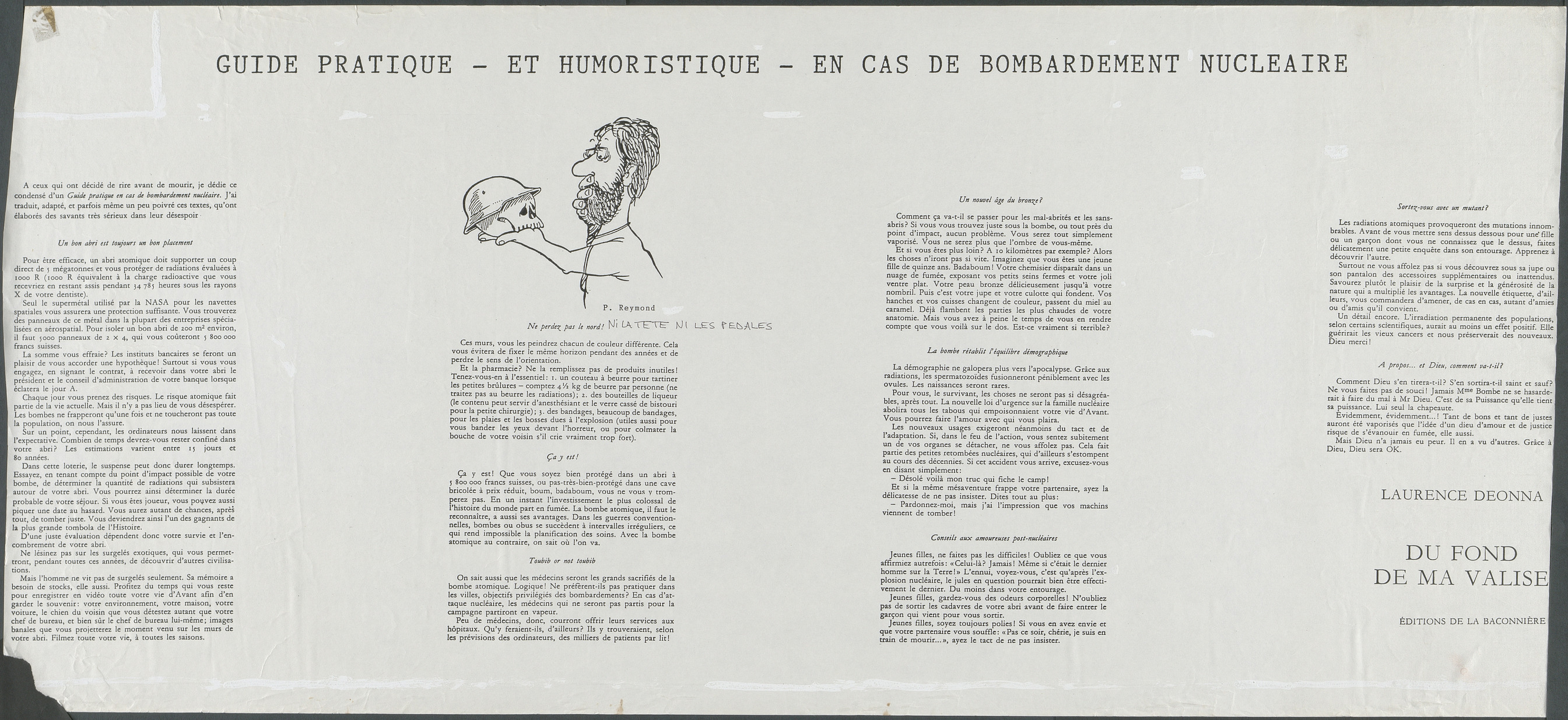 « À ceux qui ont décidé de rire avant de mourir, je dédie ce condensé d'un Guide pratique en cas de bombardement nucléaire. J'ai traduit, adapté et parfois même un peu poivré ces textes, qu'ont élaborés des savants très sérieux dans leur désespoir. »