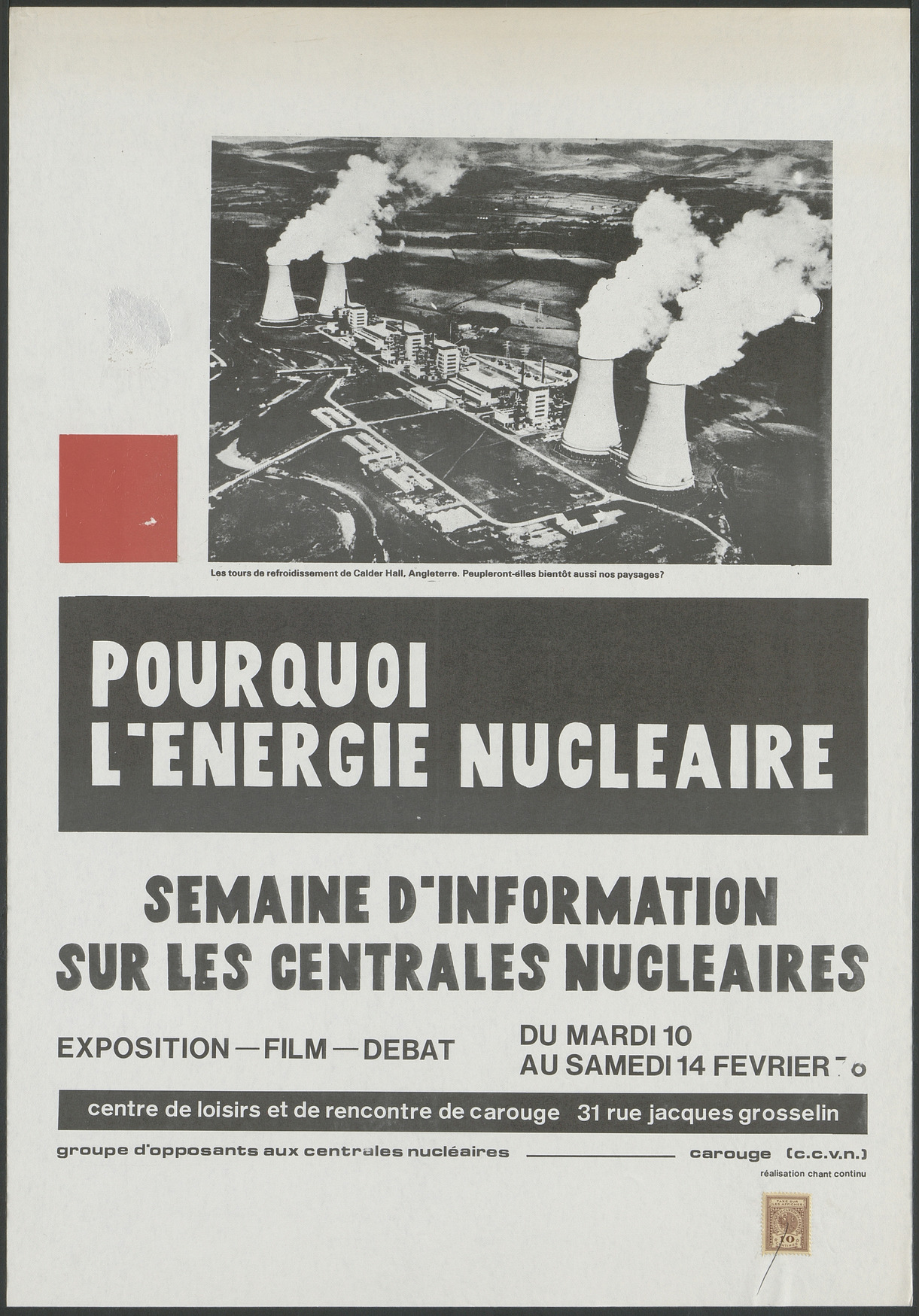 Affiche pour une semaine d'information sur les centrales nucléaires au centre de loisirs et de rencontre de Carouge. Exposition, film, débat. Photographie représentant les tours de refroidissement de Calder Hall en Angleterre.
