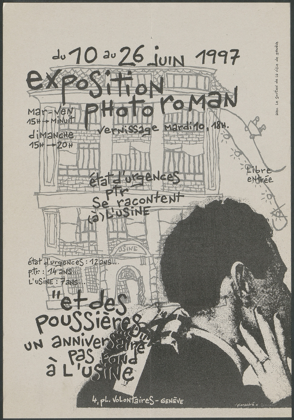 Affiche pour une « exposition photo roman » à l'occasion des 12 ans d'État d'urgences, des 14 ans de PTR et des 7 ans de L'Usine. Dessin du bâtiment du 4, Place des Volontaires et personnage la tête penchée, les yeux fermés dans un baiser. Cette affiche constitue un dyptique.