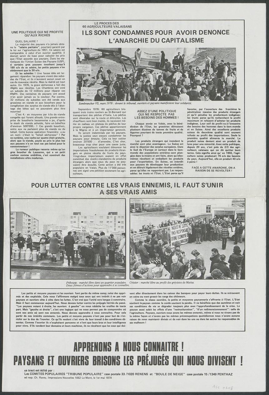 Affiche-tract dénonçant le « nouvel arrêté fédéral sur l'économie laitière » et les conditions de travail des « petits et moyens paysans » face aux gros agriculteurs et à l'État. Brève sur le procès de 60 agriculteurs valaisans accusé d'émeute pour avoir bloqué trois transports routiers important des pêches italiennes. Photographies d'une manifestation de paysans avec une banderole portant l'inscription « Surproduction laitière / dirigeants responsables » et des marchés libres à Fribourg et Crissier.