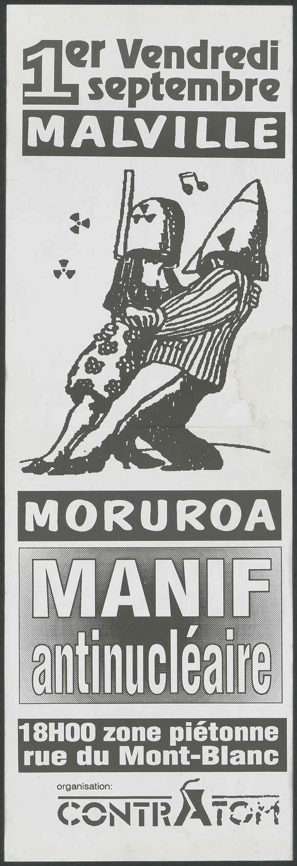 Affiche pour une manifestation antinucléaire à Genève, à propos de la centrale de Creys-Malville et des essais nucléaires menés par l'État français à Moruroa en Polynésie française. Dessin représentant deux personnages qui dansent, portant des masques avec le symbole de la radioactivité.
