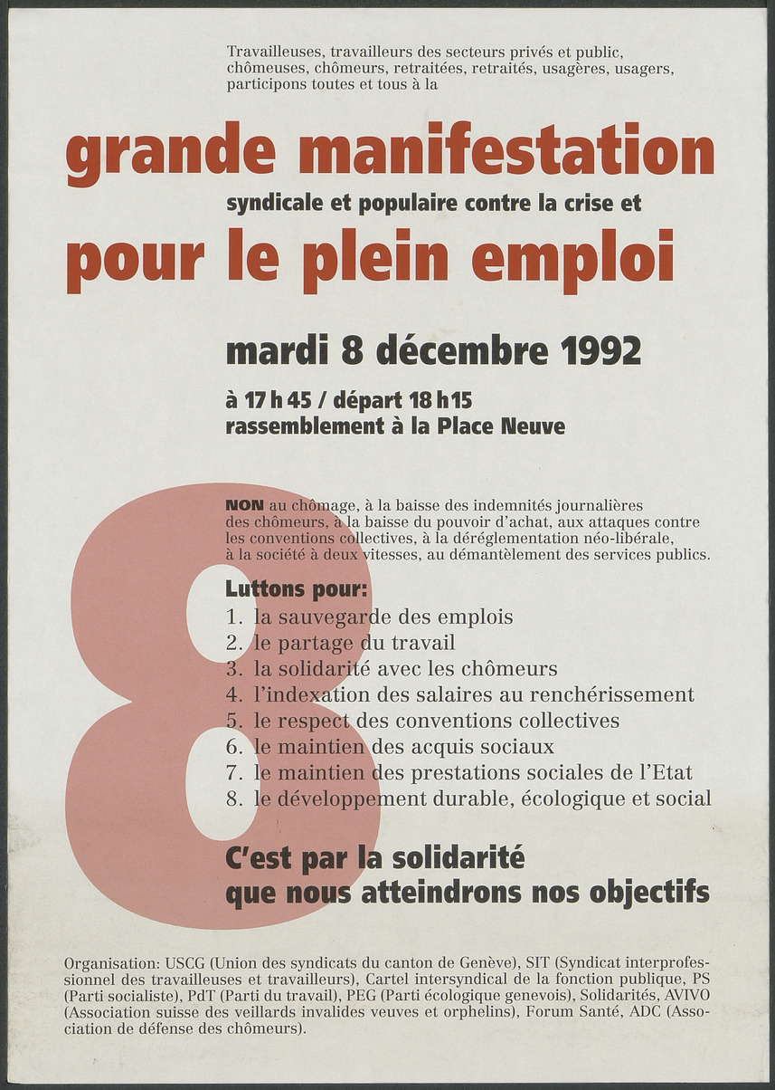 Affiche pour une manifestation « syndicale et populaire contre la crise » à Genève.