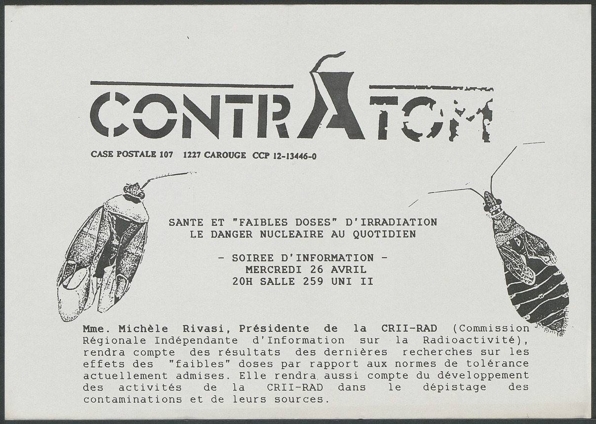 ContrAtom est une association, reconnue d’utilité publique, fondée à la fin de 1985 pour s’opposer à la foire du nucléaire (ENC’86) qui se tenait à Palexpo (Genève) en juin 1986. 3000 personnes manifestèrent contre cette foire et celle de 1990 (ENC’90) fut précipitamment déplacée à Lyon…