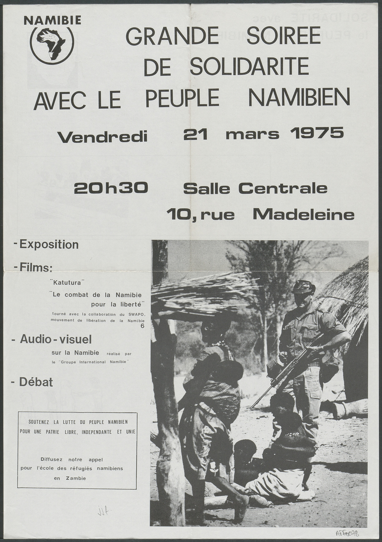 Affiche pour une exposition, des films et un débat sur les luttes anti-apartheid en Afrique du Sud, sur la situation en Afrique australe et sur le SWAPO (South West Africa People's Organization) de Namibie.