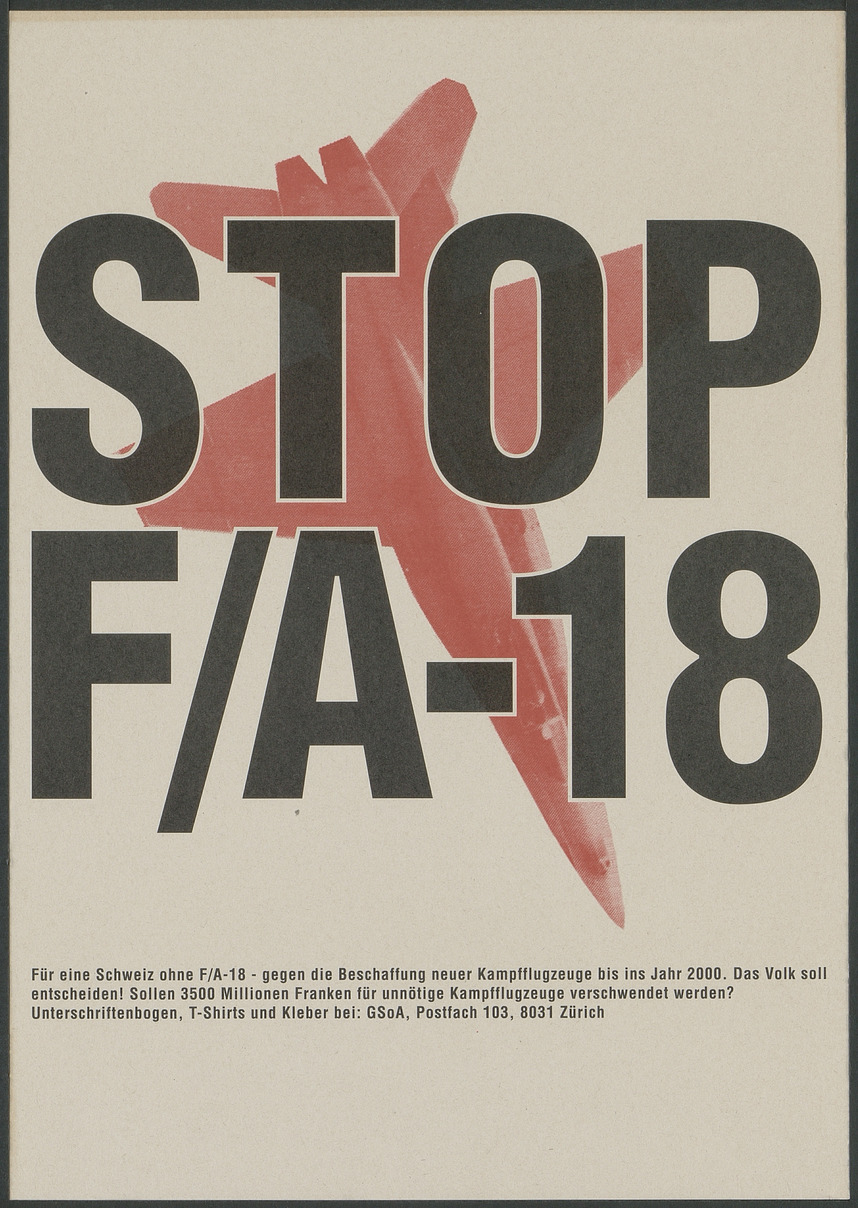 Affiche représentant un avion de chasse en rouge et le slogan « STOP F/A-18 » en noir.