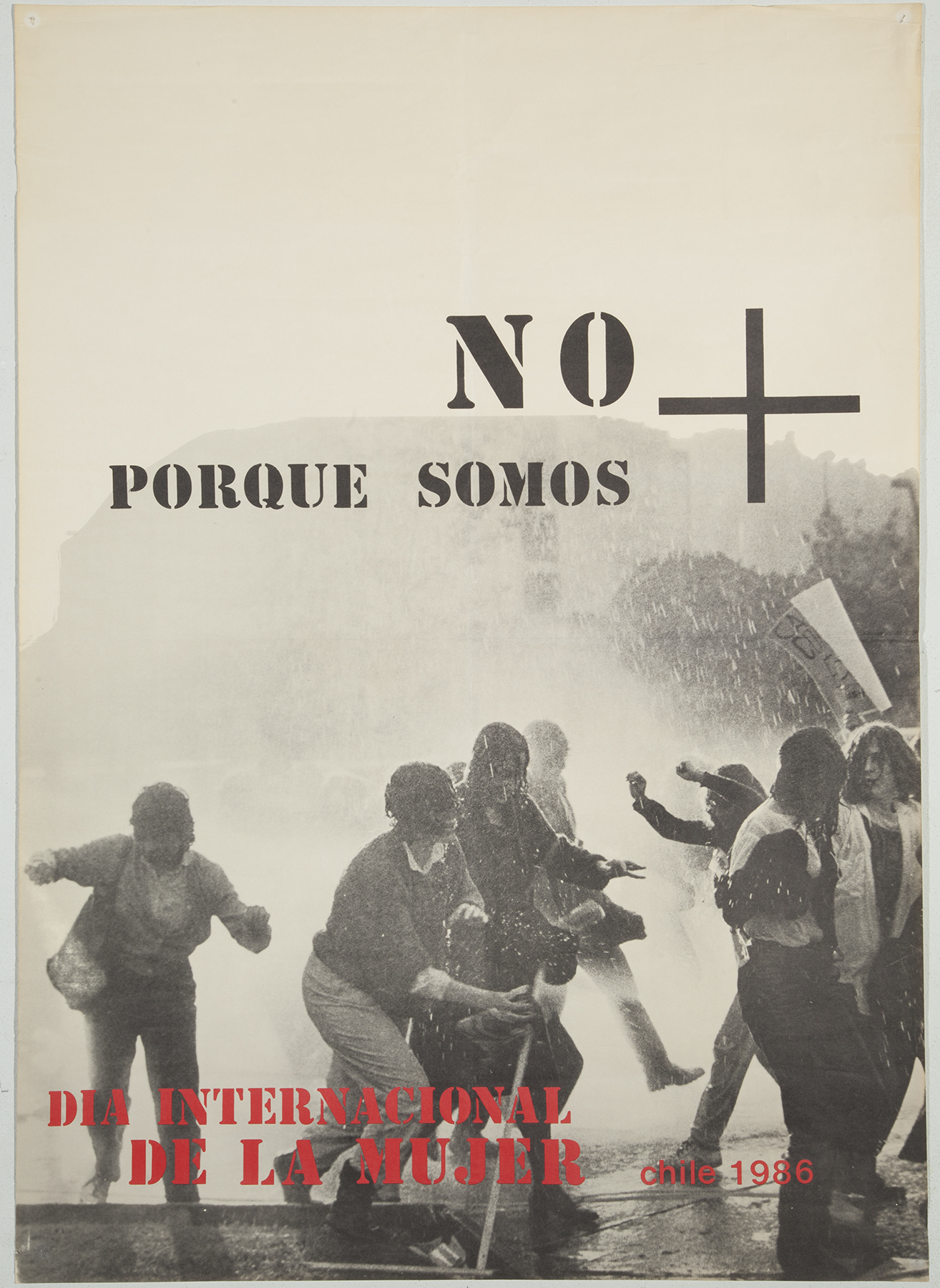 Il s'agit d'une affiche (rouge et niveaux de gris sur papier blanc) intitulée "No más, porque somos más", faite à l'occasion de la journée internationale des femmes en 1986 au Chili.
