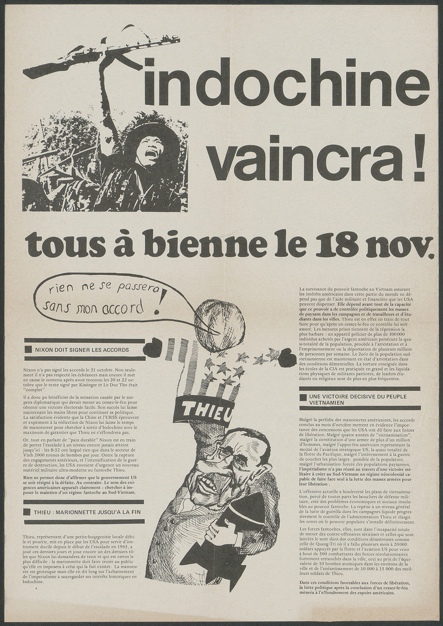 Appel à une manifestation à Bienne en soutien aux « forces révolutionnaire en Indochine ». Ventes des « artistes pour le Vietnam » en « soutien financier au peuples indochinois ».