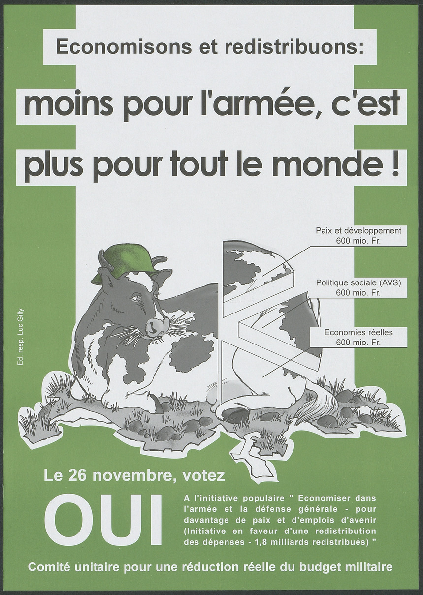 Affiche pour l'initiative populaire « Economiser dans l'armée et la défense générale - pour davantage de paix et d'emplois d'avenir (initiative en faveur d'une redistribution des dépenses) ». L'initiative souhaite modifier la Constitution fédérale afin de réduire de moitié les crédits alloués à la Défense sur une période transitoire (source). Affiche représentant une vache portant un casque militaire, allongée sur la carte de la Suisse en pictogramme, l'arrière train divisé en trois comme suit : « Paix et développement, 600 mio. Fr. / Politique sociale (AVS), 600 mio Fr. / Économies réelles, 600 mio Fr. »