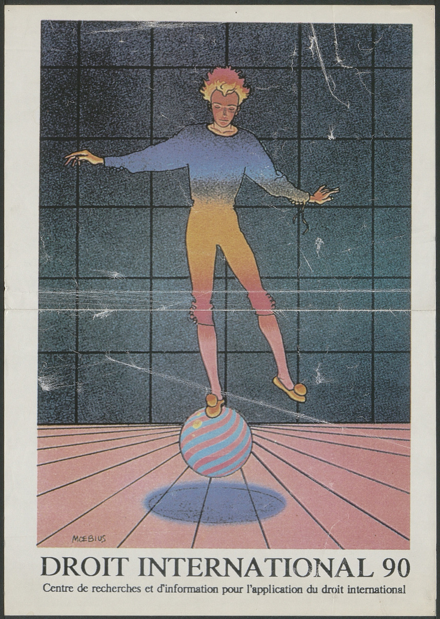 Affiche du Centre de recherches et d'informations pour l'application du droit international. Dessin de Moebius représentant un personnage en équilibre sur une bille rose et bleu.