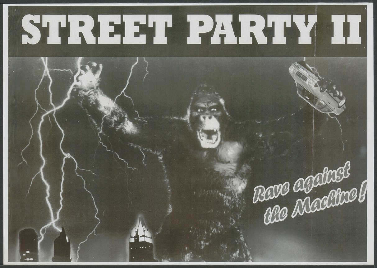 Image de King Kong brandissant une voiture dans son poing, derrière la foudre et des grattes-ciels.