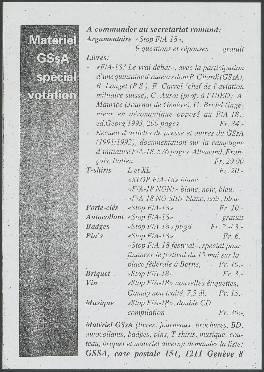 En 1992, le parlement décide de l’achat de 34 avions de combat F/A-18. Le GSsA lance une initiative pour une Suisse sans nouveaux avions de combat. En un mois, 503’519 signatures sont récoltées. Au mois de mai, suite à une initiative parlementaire, le principe d’un service civil est largement plébiscité par le peuple. La loi n’entrera en vigueur qu’en 1996, suite à d’âpres discussions parlementaires.