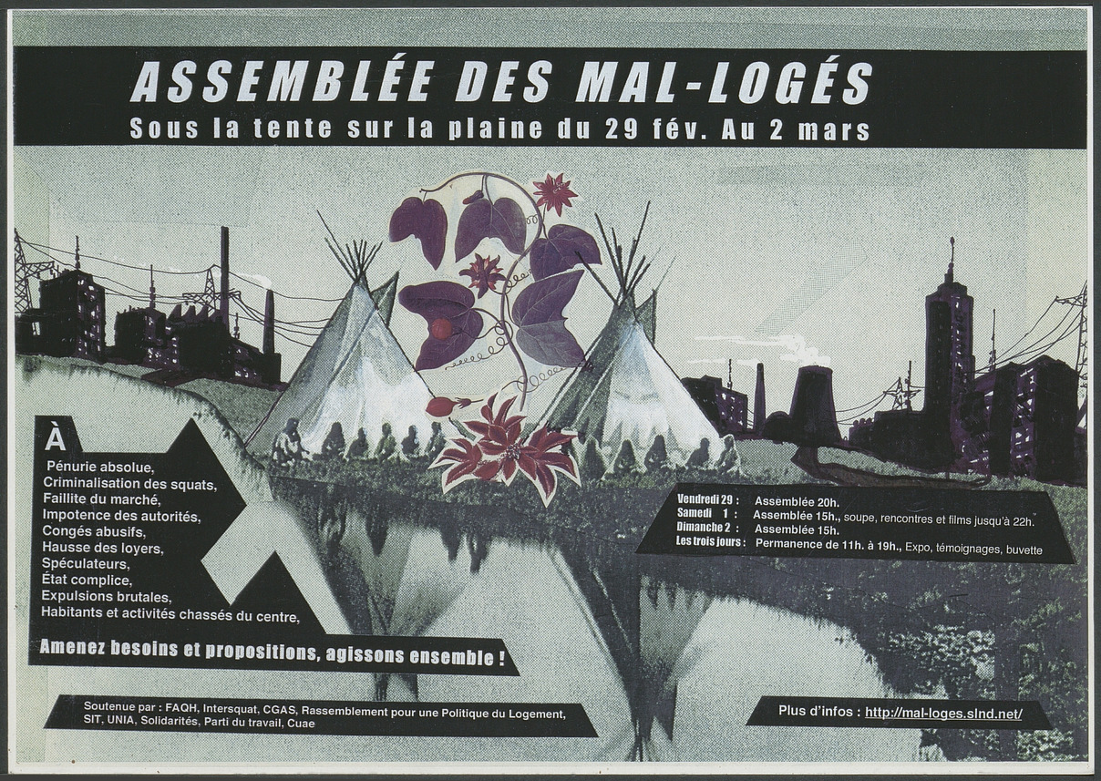 Affiche pour la cinquième assemblée des mal-logés sur la plaine de Plainpalais.