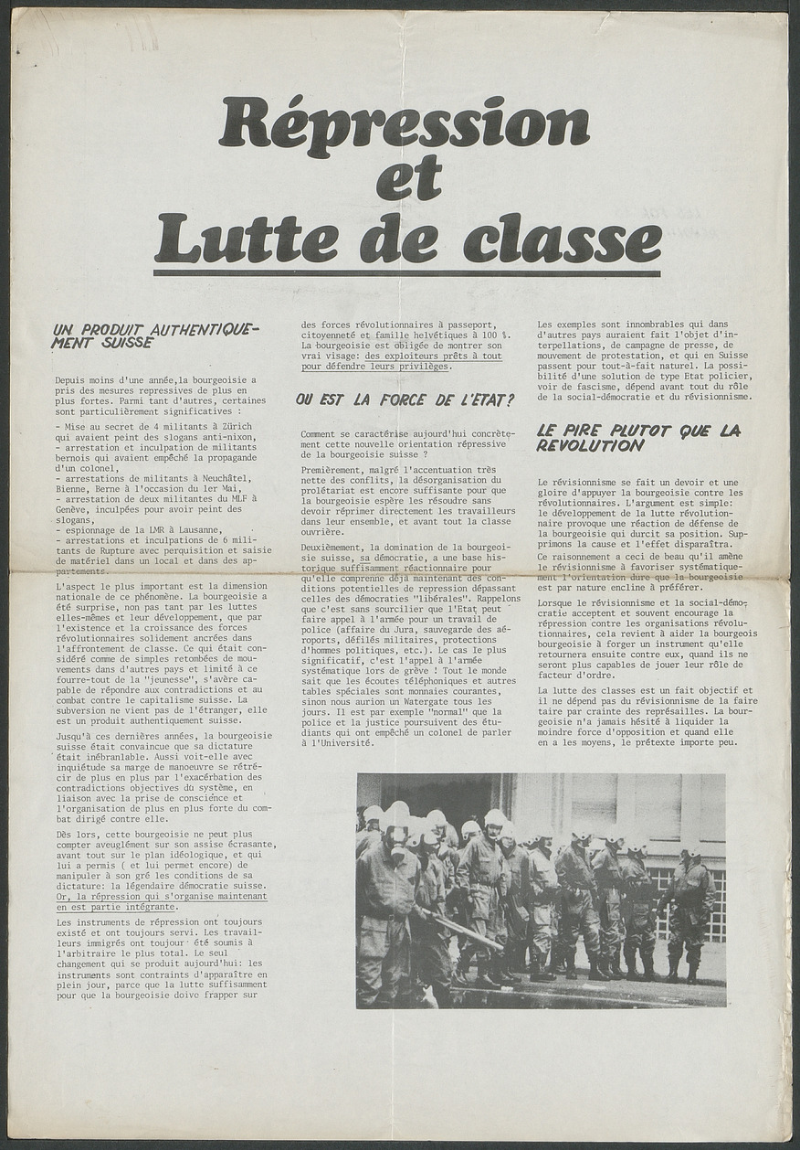 Affiche-tract abordant la question de la répression « bourgeoise » qui vise les militants marxistes-léninistes, la classe ouvrière et les travailleurs étrangers en Suisse. Appel à une manifestation à Genève en soutien aux inculpés de l'école de recrue ER.PA.246.