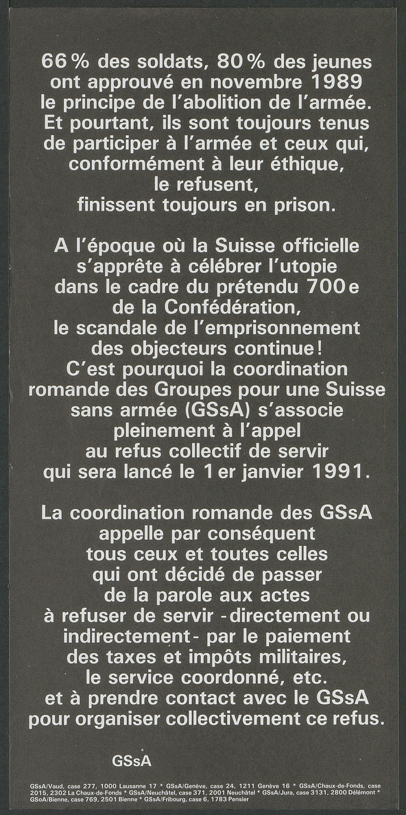 En 1990, le GSsA lance un appel au refus collectif de servir, suite aux révélations sur l’armée secrète P26 et le service de renseignement clandestin P27. Les objecteurs de conscience devaient affronter les tribunaux en se réclamant d’un mouvement, afin d’obtenir l’introduction d’un service civil. Les tribunaux jugent néanmoins les objecteurs au cas par cas.