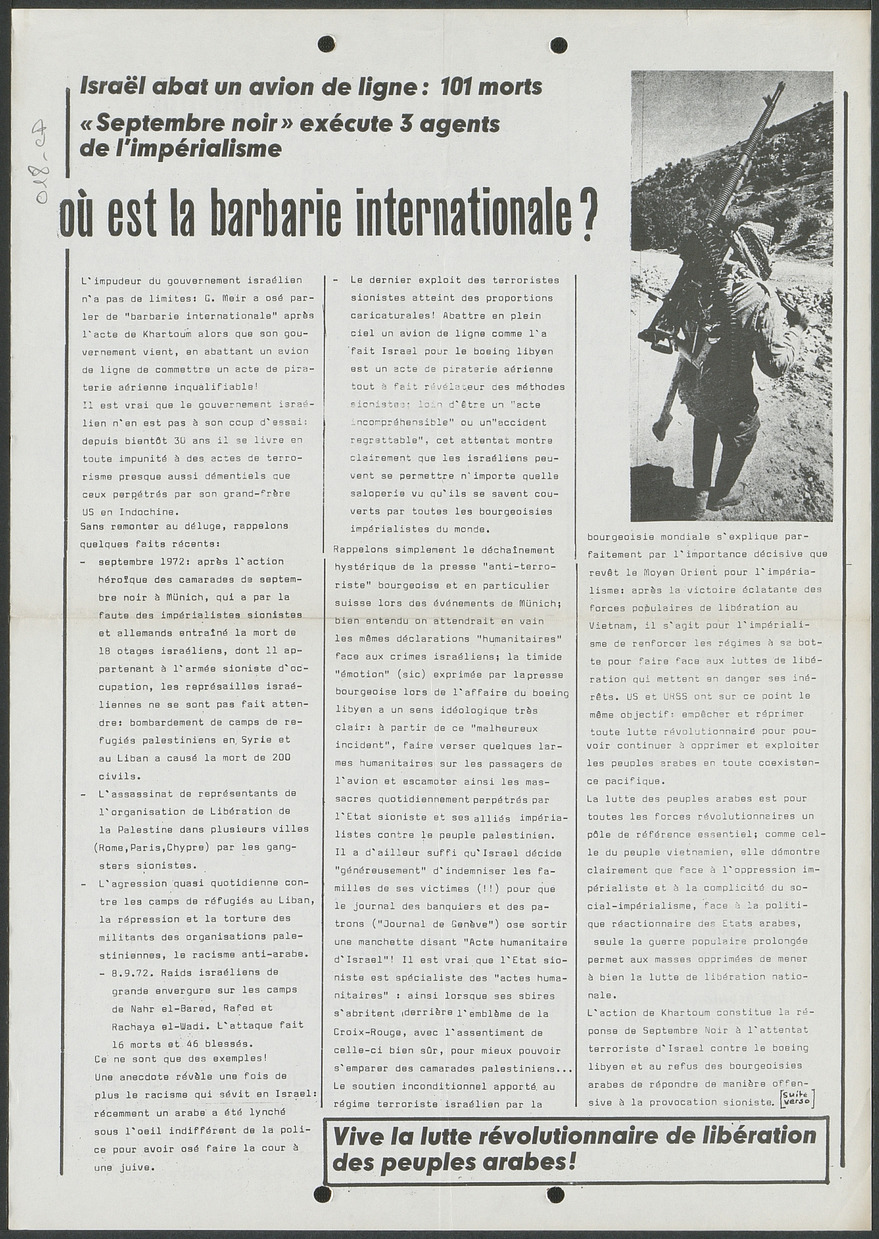 Affiche-tract documentant les événements qui ont suivis l'assassinat des athlètes israéliens pendant les Jeux Olympiques de Munich en 1972, et les représailles israéliennes. Le verso aborde les relations de la Suisse avec le Shah d'Iran. Appel à « une réunion de débat et de discussion » à Genève.