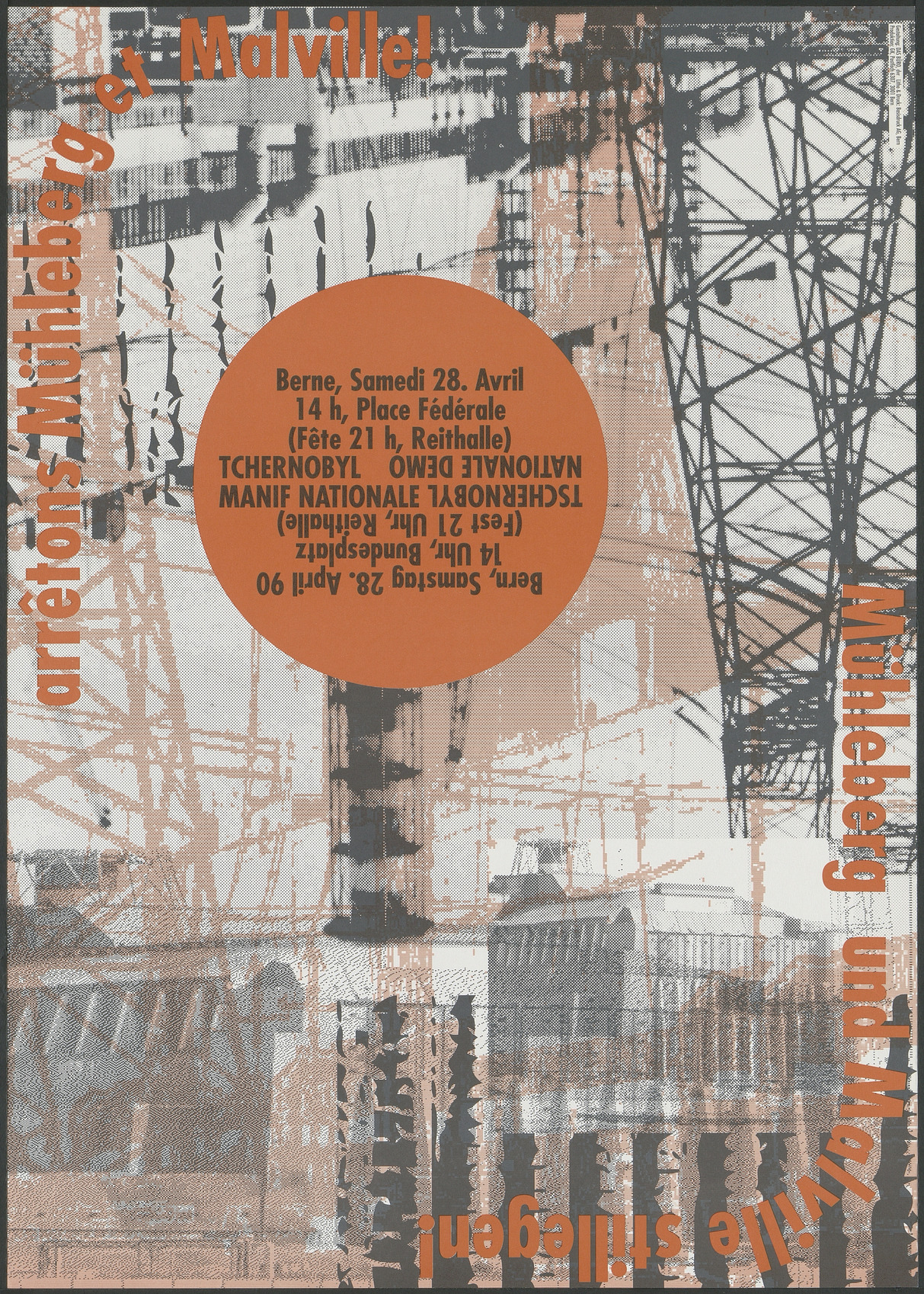 Affiche pour une manifestation nationale à Berne, contre les centrales de Crey-Malville et Mühleberg, à l'occasion du 4ème anniversaire de Tchernobyl.