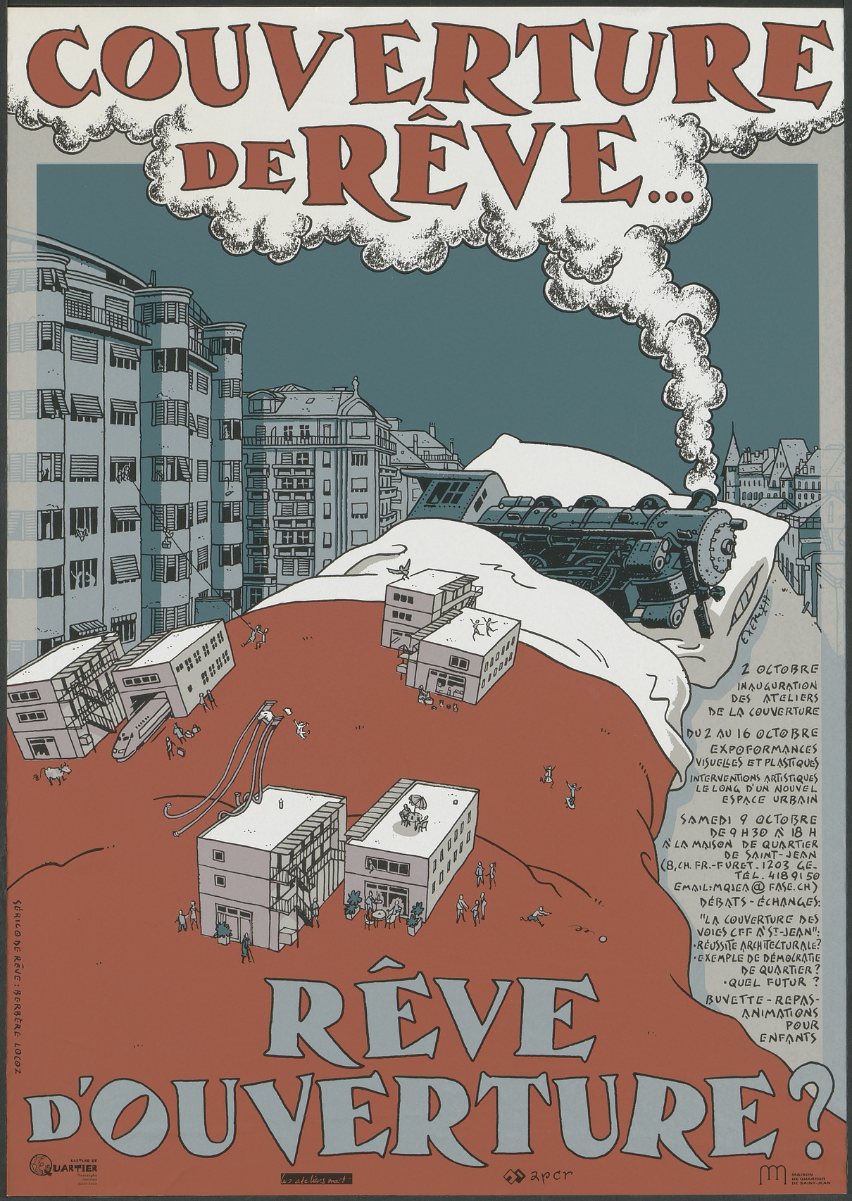 Affiche pour l'inauguration de la couverture des voies CFF du quartier de Saint-Jean et des ateliers de la couverture. Interventions artistiques.