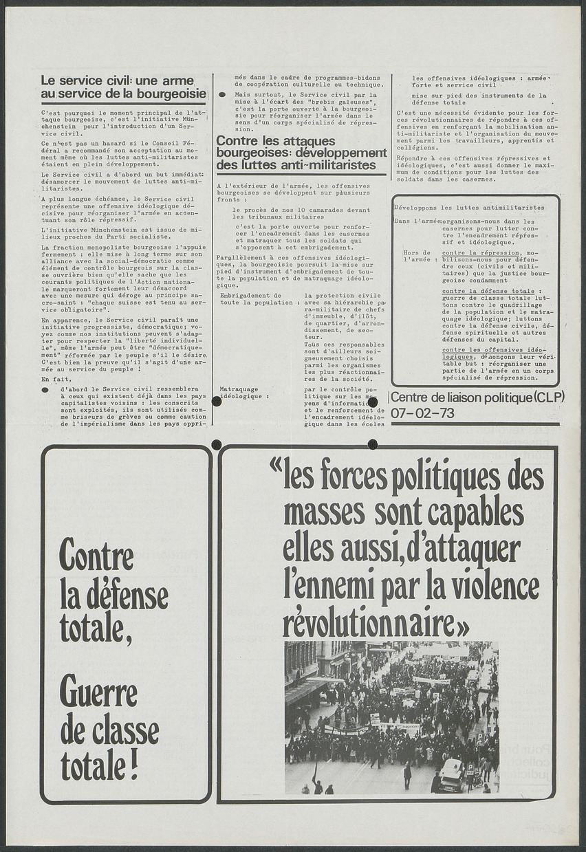 Selon le premier numéro du Journal du Centre de liaison politique (mai 1971, AC P104/1239), le «Centre de liaison politique est le résultat d'une fusion entre le MSR [Mouvement socialiste révolutionnaire], groupe de militants issus du Mouvement du 17 mai et Z, groupe de militants issus du Parti du travail. [...] C'est à partir d'un accord à minima face à cette offensive [du patronat]: réorganisation du travail, licenciements, changements de qualifications, augmentation des rythmes de travail, exigences d'heures supplémentaires et concentration, fusion d'entreprises [...] que c'est réalisé pratiquement le processus d'unification de ces deux groupes.»