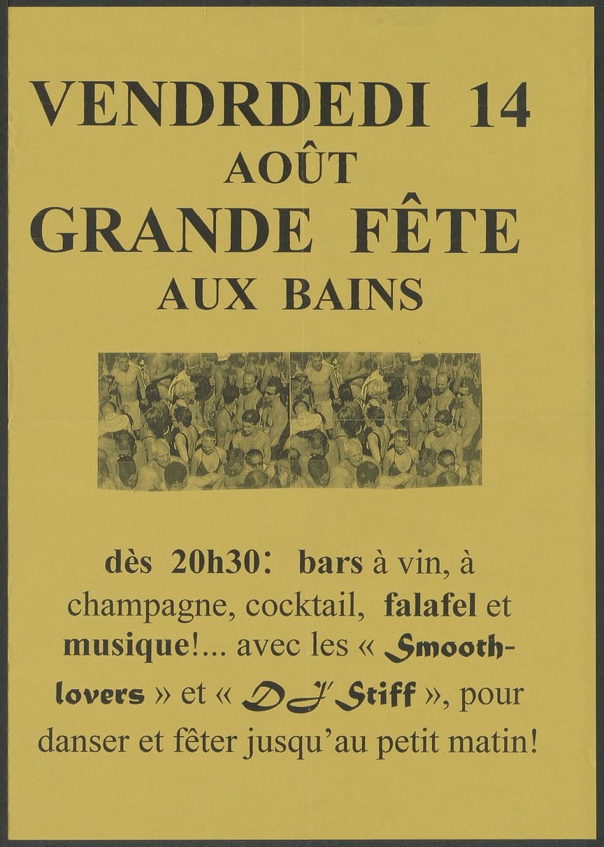 Affiche pour une fête aux Bains des Pâquis. Photographie d'une foule en maillot de bain.