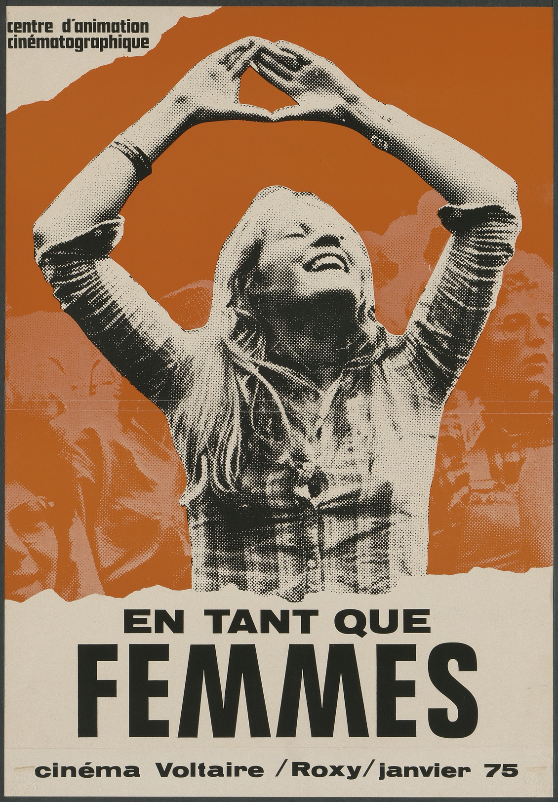 Affiche et programme pour le cycle de projection de films réalisés par des femmes « En tant que femmes » au cinéma Voltaire. Liste et description des films au verso, calendrier des projections. Image au recto d'une femme faisant un signe de triangle avec ses mains au dessus de sa tête.