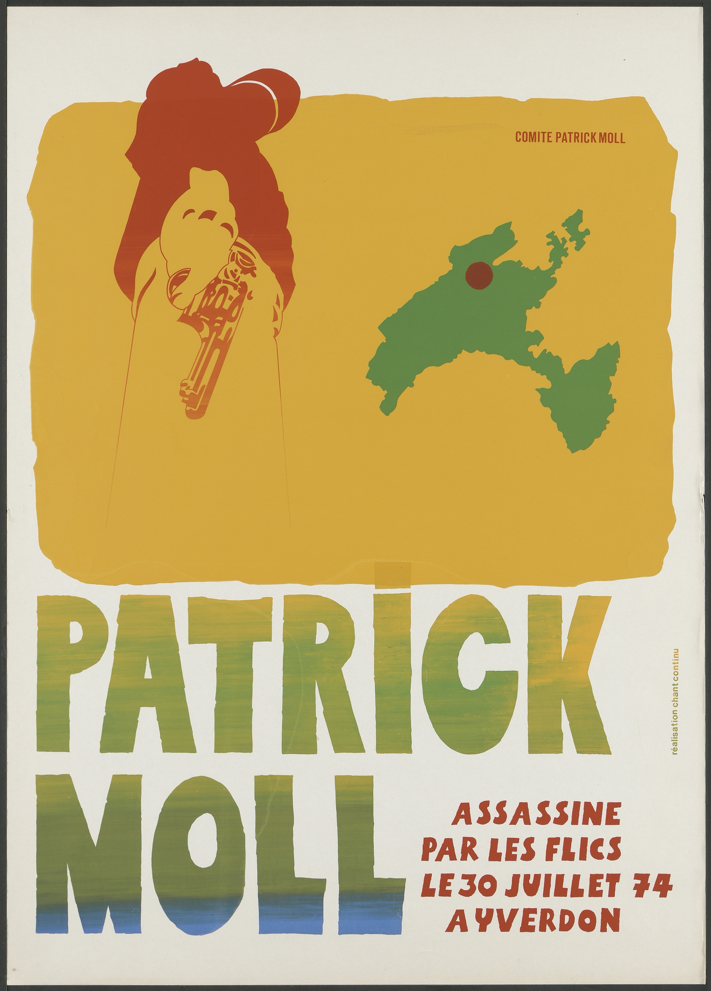 Affiche pour Patrick Moll, « assassiné par les flics le 30 juillet 1974 à Yverdon ».